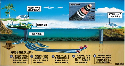 “這一工程中采用的電纜,直徑超過17厘米,足足有成年人的大腿那么粗,是目前國內(nèi)最粗的電纜。而且很重,每米電纜就有87千克。”負(fù)責(zé)該項(xiàng)目施工的廈門電業(yè)局基建工程師江慧聰告訴記者。