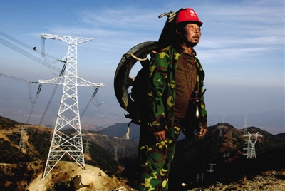 工程西昌地區(qū)錦屏水電送出工程,無人區(qū)地段,海拔3300米的高山上,施工人員完全靠體力將各種器械背上山。