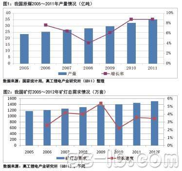 礦燈是煤礦井下生產(chǎn)必要的工具,是保證礦工安全生產(chǎn)重要防護(hù)用具。煤礦用燈國內(nèi)市場需求量隨著我國煤礦整體產(chǎn)能擴(kuò)張而增加;國際市場由于受益于我國制造水平提升和較低制造成本市場,份額穩(wěn)步提升。煤礦用燈總需求合計占我國礦燈總體市場50%份額,其余用于石油、化工、鐵路、運(yùn)輸、倉儲等存在易燃易爆的可燃?xì)怏w環(huán)境中的安全照明或者搶險照明。高工鋰電產(chǎn)業(yè)研究所(GBII)統(tǒng)計數(shù)據(jù)表明,我國礦燈總體需求量從2005年1170萬套上升至2011年1450萬套,年均保持3.3%的增長速度;預(yù)計2012年為1500萬套(圖2),相比2011年增長3.45%,延續(xù)平穩(wěn)較低的增長速度。