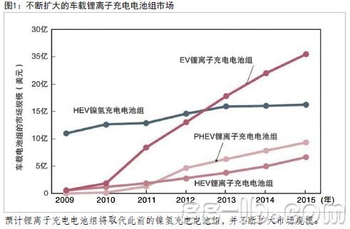 美國A d v a n c e d A u t o m o t i v eBatteries公司的Menahem Anderman預測稱,EV用鋰離子充電電池組的市場規(guī)模在2011年約為8億美元,到2012年將超過10億美元,2015年將達到25億美元(圖1)。