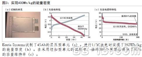 該公司就可實現(xiàn)目前車載鋰離子充電電池約3倍能量密度、即400Wh/kg的電池。通過組合使用固溶體類正極材料以及由硅合金和碳材料構(gòu)成的Si-C負極材料,實現(xiàn)了高能量密度的試驗結(jié)果(圖3)。