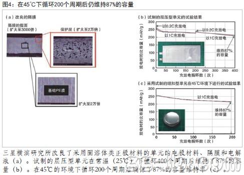 充放電循環(huán)特性方面,在常溫(25℃)下以1C的充放電速率循環(huán)400個周期后維持了87%的容量。另外,還采用紐扣型單元在45℃的高溫環(huán)境下實施了更加嚴格的試驗。結(jié)果顯示,在充放電循環(huán)試驗中,以1C的充放電速率循環(huán)200個周期后維持了87%的容量。“作為足夠耐用的鋰離子充電電池值得期待。”三星橫濱研究所認為。