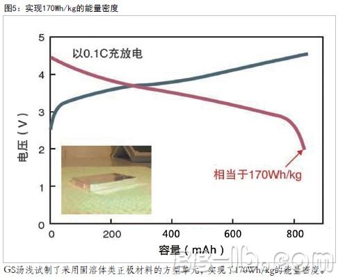 GS湯淺發(fā)表了采用該材料試制0.8Ah方型單元的結(jié)果(圖5)。在常溫(25℃)下進行0.1C的充放電實現(xiàn)了170Wh/kg的能量密度。