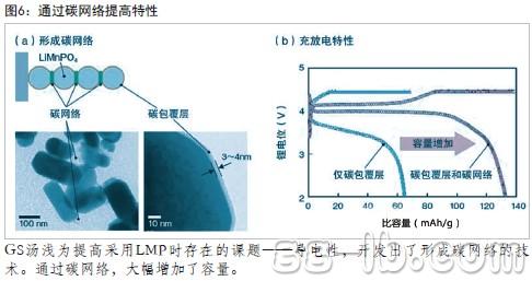 不過,LMP存在的一大課題是,導電性比LFP低。GS湯淺通過用碳包覆LMP粒子,并構(gòu)筑連接LMP粒子的“碳網(wǎng)絡(luò)(Carbon Network)”提高了性能(圖6)。