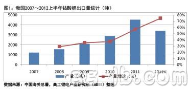 中國儲(chǔ)能網(wǎng)訊:鈷酸鋰出口量大幅增長原因分析根據(jù)中國海關(guān)總署統(tǒng)計(jì)數(shù)據(jù)表明自從2007年以來,我國鈷酸鋰的出口量連續(xù)保持高速增長,2007年出口量只有1200噸,而2011年達(dá)4500噸,5年間出口量增長達(dá)275%,而近兩年呈現(xiàn)加速的趨勢(shì),2012年1~6月份出口量達(dá)3300噸,增速高達(dá)74%左右(圖1);高工鋰電產(chǎn)業(yè)研究所預(yù)計(jì),由于2011年下半年鈷酸鋰出口基數(shù)比較高,2012下半年出口增長速度有所下降,但全年出口量仍將達(dá)到7000噸,同比2011年增長55%。