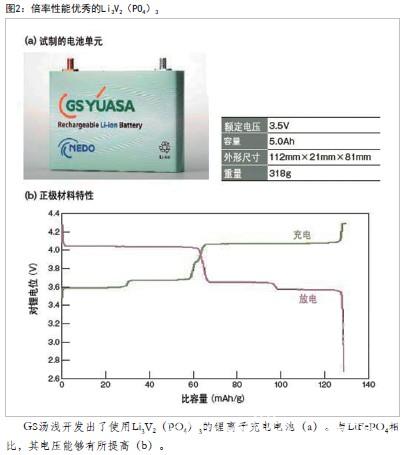 另一方面,在橄欖石類材料中,G S湯淺建議使用磷酸釩鋰(L i 3V 2(PO4)3)(圖2)。該材料不僅在安全性方面有望與L i F e P O 4相當(dāng),理論容量也高達(dá)1 9 7 m A h / g , 比LiFePO4和LiMnPO4還高出25mAh/g以上。而且,對鋰電位可以達(dá)到3.8V左右,比LiFePO4還高0.4V左右。