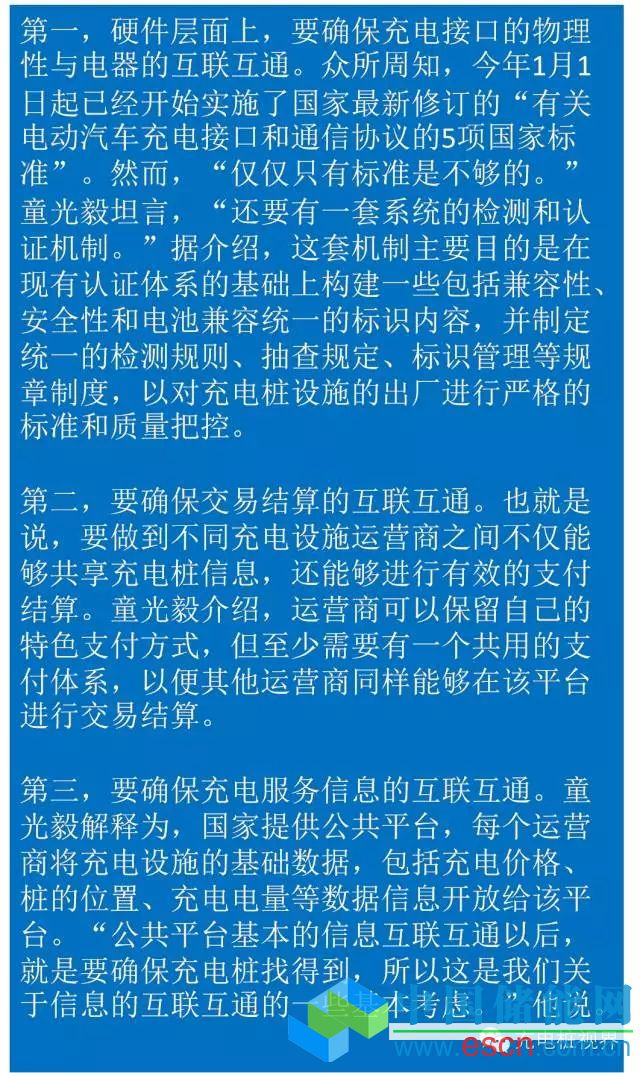 “所謂充電基礎(chǔ)設(shè)施的互聯(lián)互通,就是充分發(fā)揮充電設(shè)施的利用效率,最大程度為用戶提供充電的便利,努力實現(xiàn)各個已建樁之間、各個運營商之間信息的共享、共用,確保做到有樁找得到、充得上、能支付?!眹夷茉淳蛛娏λ靖彼鹃L童光毅在2016年中國電動汽車百人會上表示。而如何進一步實現(xiàn)互聯(lián)互通,他提出了三個層次。