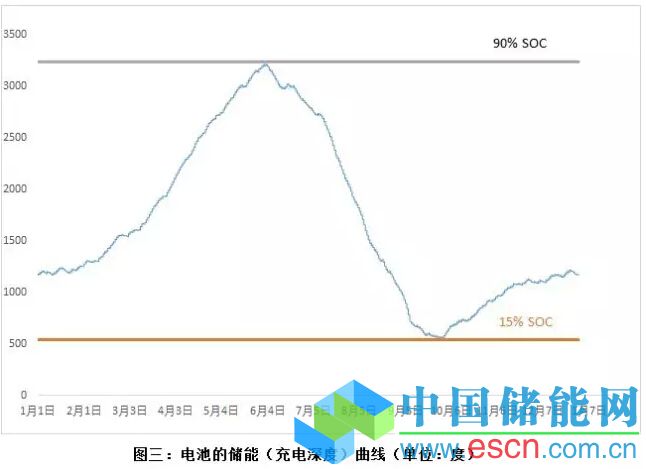 電池的年充電深度曲線見圖三,在夏季高峰前,電池的儲能達(dá)到最高峰3220度(89.5%充電深度),在夏季結(jié)束后,電池儲能降為550度(15.3%充電深度),等待秋、冬、春的三個充電季節(jié)的來臨。