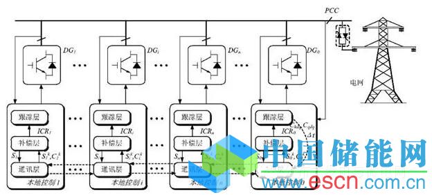 本發(fā)明涉及微電網(wǎng)和電能質(zhì)量管理,旨在提供一種用于微電網(wǎng)中多功能并網(wǎng)逆變器并聯(lián)的群體智能控制方法。該方法針對微電網(wǎng)并網(wǎng)點(diǎn)PCC處的指定次數(shù)諧波、無功電流,采用一種多功能逆變器群體智能控制策略,采用基于有限時間一致性算法的全分布式分層控制方案進(jìn)行補(bǔ)償,并實(shí)現(xiàn)各分布式電源按照自身剩余容量比例分?jǐn)傃a(bǔ)償容量的控制方法。