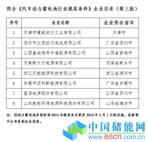 根據(jù)專家審查意見,現(xiàn)將符合《汽車動力蓄電池行業(yè)規(guī)范條件》企業(yè)目錄(第三批)予以公示。如有異議,請于2016年4月19日前以書面?zhèn)髡婊螂娮余]件形式反饋至部裝備工業(yè)司汽車處(傳真:010-66013708;電子郵箱:chencm@miit.gov.cn)。