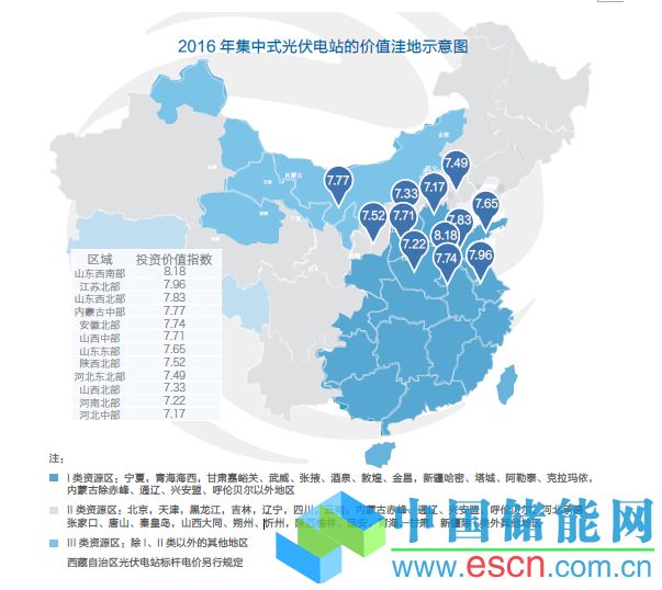 我國太陽能資源區(qū)分為三類,自2016年1月1日起,我國光伏標桿上網(wǎng)電價執(zhí)行新標準,I、II類資源區(qū)分別降低10分錢、7分錢,III類資源區(qū)降低2分錢。根據(jù)上網(wǎng)電價這一變量要素,利用投資價值指數(shù)公式計算可得出,上網(wǎng)電價的下調(diào),使三類資源區(qū)的投資價值顯現(xiàn)。