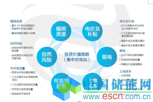 針對以上行業(yè)痛點,遠景能源與中國氣象局風能太陽能資源中心等部門結(jié)合輻照資源、電價補貼、限電、土地成本、可開發(fā)容量、自然風險六大維度,建立覆蓋全國的集中式光伏電站投資價值數(shù)據(jù)庫,提出集中式光伏電站的“投資價值指數(shù)”,推出《2016年中國光伏資源投資價值地圖(集中式電站篇)》,打造符合中國本土的資源數(shù)據(jù)庫和投資模型。