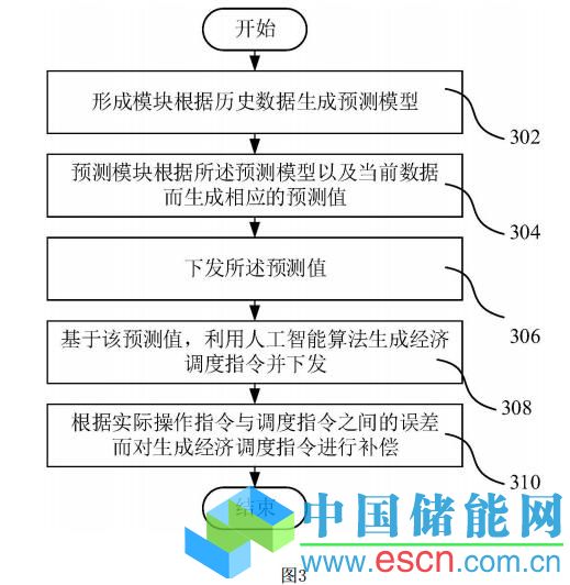通信模塊108與預(yù)測模塊106相連,用于將預(yù)測模塊106所生成的預(yù)測值送至經(jīng)濟(jì) 調(diào)度子系統(tǒng)103。在一種實(shí)施方式中,通信模塊108實(shí)現(xiàn)為通訊Agent,其將預(yù)測模塊106(預(yù) 測Agent)所得到的預(yù)測值送出。可以理解的是,基于前述的根據(jù)預(yù)測數(shù)據(jù)和天氣數(shù)據(jù)而預(yù) 測得到的預(yù)測值,可以由經(jīng)濟(jì)調(diào)度模塊來運(yùn)行人工智能算法,以生成相應(yīng)的經(jīng)濟(jì)調(diào)度指令。