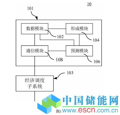 如圖1所示,其為本發(fā)明一種實(shí)施方式的微電網(wǎng)能量管理系統(tǒng)的結(jié)構(gòu)示意圖。該微 電網(wǎng)能量管理系統(tǒng)10包括預(yù)測子系統(tǒng)101、經(jīng)濟(jì)調(diào)度子系統(tǒng)103等。經(jīng)濟(jì)調(diào)度子系統(tǒng)103調(diào)用 預(yù)測子系統(tǒng)101,以啟停所述預(yù)測子系統(tǒng)101,并基于所述預(yù)測子系統(tǒng)101的預(yù)測值而生成相 應(yīng)的經(jīng)濟(jì)調(diào)度指令而進(jìn)行下發(fā)。在該實(shí)施方式中,預(yù)測子系統(tǒng)101包括:數(shù)據(jù)模塊102、形成 模塊104、預(yù)測模塊106、通信模塊108等。