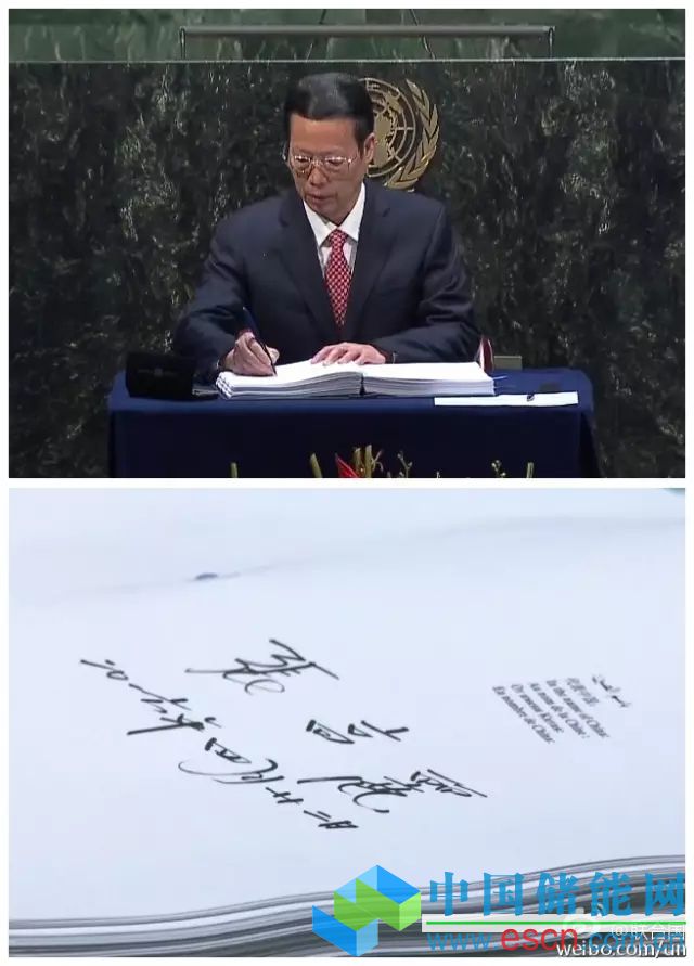 圖為中國國務(wù)院副總理張高麗作為習(xí)近平主席特使在《巴黎協(xié)定》上簽字。(來自@聯(lián)合國 官方微博)