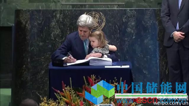溫馨一刻:美國國務(wù)卿克里抱著自己的孫女上臺,代表美國在《巴黎協(xié)定》上簽字。(來自@聯(lián)合國 官方微博)