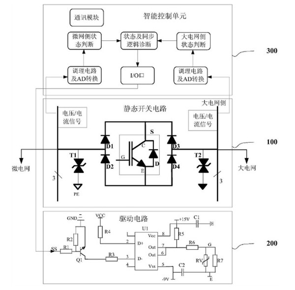 一種微電網(wǎng)用柔性并離網(wǎng)切換裝置由靜態(tài)開(kāi)關(guān)電路、驅(qū)動(dòng)電路及智能控制單元組成。靜態(tài)開(kāi)關(guān)電路是切換裝置的硬件主體;采用全控型半導(dǎo)體器件IGBT實(shí)現(xiàn)快速通斷;并通過(guò)IGBT模塊與四個(gè)二極管的排列實(shí)現(xiàn)其對(duì)雙向電壓與電流的阻斷能力;在微電網(wǎng)及大電網(wǎng)的交流母線(xiàn)上均裝有浪涌吸收抑制器件,避免IGBT過(guò)壓失效。驅(qū)動(dòng)電路采用光藕驅(qū)動(dòng);并實(shí)現(xiàn)控制信號(hào)與驅(qū)動(dòng)信號(hào)的隔離;通過(guò)+15V與-9V的驅(qū)動(dòng)電壓確保IGBT快速可靠通斷。