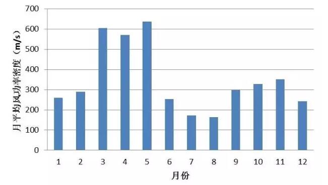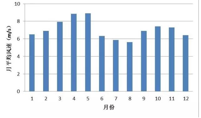 該風(fēng)電場場內(nèi)測風(fēng)塔70m高度年平均風(fēng)速分別為7.1m/s,年平均風(fēng)功率密度348.0W/m2,3~5月、10~11月風(fēng)速風(fēng)功率密度較大,6~9月風(fēng)速風(fēng)功率密度較小。從日變化上來看21:00~凌晨3:00風(fēng)速風(fēng)功率密度較大,8:00~19:00風(fēng)速風(fēng)功率密度相對較小。