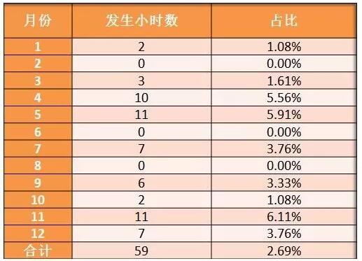 對光伏電站出力比較集中的時間段內(nèi)(9:00~15:00),風(fēng)電場的出力進(jìn)行分析,篩選出風(fēng)電場出力大于9萬kW發(fā)生小時數(shù)見下表。