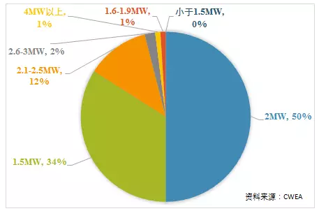 2015年新增裝機中,1.5MW機組和2MW機組占市場主導(dǎo)地位,市場份額達(dá)84%,2MW風(fēng)電機組裝機市場份額首次超過1.5MW機組,占全國新增裝機容量的50%。與2014年相比,1.5MW機組市場份額下降12個百分點,而2MW機組所占市場份額上升9個百分點。2.1MW至2.5MW機組市場份額達(dá)到12%,其中主要是以2.5MW為主。2.6MW至3MW機組市場份額為2%,其他機組裝機占比在1%以下。
