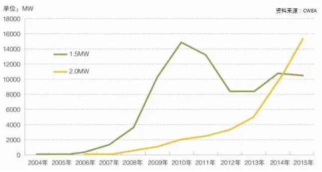 2004年至2010年,借勢我國風(fēng)電政策和風(fēng)電產(chǎn)業(yè)發(fā)展東風(fēng),1.5MW風(fēng)電機組得到快速發(fā)展,并成為主流風(fēng)機類型,在這期間2MW風(fēng)電機組則由于技術(shù)、成本以及市場需求等因素影響,發(fā)展較為平緩。2010年之后,經(jīng)過多年的技術(shù)和管理積累,加之國家對風(fēng)電產(chǎn)業(yè)發(fā)展的強力推動,2MW風(fēng)電機組增速顯著,并在2015年超越1.5MW風(fēng)機,裝機超過1500萬千瓦。