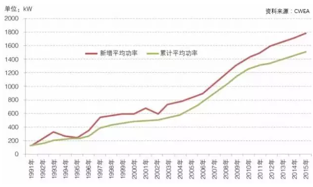 2015年,我國新增裝機的風(fēng)電機組平均功率達(dá)到1837kW,與2014年的1768kW相比,增長3.9%;累計裝機的風(fēng)電機組平均功率為1563kW,同比增長4%。如下圖所示,從1991年至2015年,我國風(fēng)電機組新增和累計平均功率均保持增長勢頭,且歷年新增平均功率均高于累計平均值,說明隨著風(fēng)電政策、市場、技術(shù)以及管理等的改善和提升,風(fēng)電機組一直向著增大功率方向發(fā)展,風(fēng)電的運營效率也在逐年提升,這對于風(fēng)電市場的發(fā)展以及風(fēng)能替代具有重要推動作用。