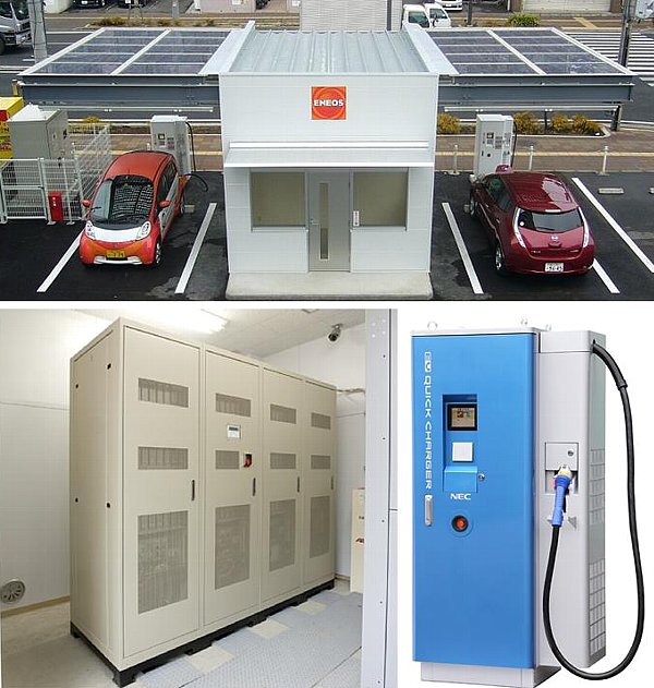 實證實驗所用BCIS由2臺額定輸出功率為50kW的快速充電器、NEC制造的額定輸出功率為64kWh的鋰離子蓄電池,以及受電變電裝置(起著變換器的作用)和負(fù)責(zé)充電管理的電力控制器組成。該系統(tǒng)于2011年末完成,目前正在位于橫濱市內(nèi)的吉坤能源的工廠內(nèi)邊向EV充電,邊進(jìn)行性能和可靠性驗證(照片2)。