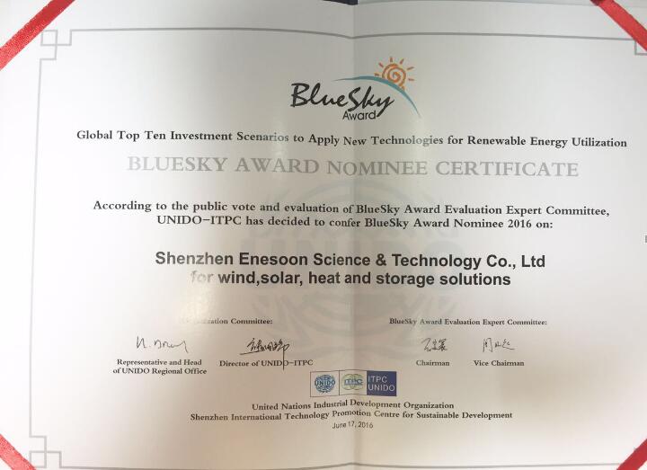 全球可再生能源領(lǐng)域最具投資價值領(lǐng)先技術(shù)藍(lán)天獎是由聯(lián)合國工業(yè)發(fā)展組織、商務(wù)部中國國際經(jīng)濟技術(shù)交流中心、深圳市人民政府、博鰲亞洲論壇、中國可再生能源學(xué)會、深圳能源集團股份有限公司共同主辦;由深圳國際能源與環(huán)境技術(shù)促進中心(ITPC)組織實施的一項在綠色環(huán)保領(lǐng)域具有影響力國際評選活動。評審專家委員會由來自全球的投融資領(lǐng)域以及可再生能源領(lǐng)域的知名專家以及投資專家的組成。