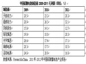 中國(guó)鉛酸電池制造商2009-2011毛利潤(rùn)(單位:%)
