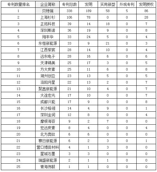 中國鋰電池負(fù)極材料企業(yè)專利數(shù)量排行榜