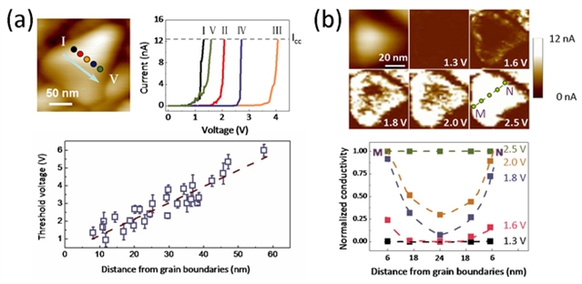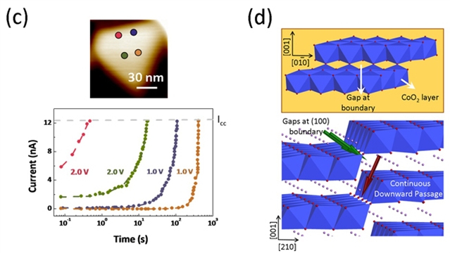 最近,該研究團(tuán)隊(duì)制備了具有穩(wěn)定阻變性能的Pt/LixCoO2/Pt三明治結(jié)構(gòu)薄膜器件,證實(shí)了器件阻變行為與電場(chǎng)作用下鋰離子的遷移密切相關(guān),并且器件的電阻狀態(tài)與薄膜中的鋰濃度相對(duì)應(yīng)。隨后,研究人員采用導(dǎo)電原子力顯微鏡(C-AFM)在納米尺度下(~10 nm)研究了電場(chǎng)作用下LixCoO2薄膜局域?qū)щ娦阅艿淖兓^(guò)程,發(fā)現(xiàn)在LixCoO2晶粒中靠近晶界處的鋰離子比遠(yuǎn)離晶界處(晶粒內(nèi)部)的鋰離子更加容易在電場(chǎng)作用下發(fā)生遷移,并且給出了晶粒大小與臨界遷移電壓的半定量關(guān)系。第一性原理計(jì)算結(jié)果表明晶界位置處鋰離子的遷移勢(shì)壘高度僅為0.7eV,遠(yuǎn)小于晶粒內(nèi)部的鋰離子的遷移勢(shì)壘高度(6.8eV),與實(shí)驗(yàn)結(jié)果基本一致。此外,他們的研究結(jié)果表明在相同電壓下小尺寸的LixCoO2晶粒中的鋰離子更加容易脫嵌,并且具有更快的遷移速度。該研究發(fā)現(xiàn)為理解納米尺度范圍內(nèi)電場(chǎng)作用下離子輸運(yùn)行為,研發(fā)高性能鋰離子電池以及發(fā)展納米離子型器件具有非常重要的意義。