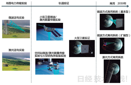 通過(guò)地面實(shí)驗(yàn)確立基礎(chǔ)技術(shù)之后,反復(fù)在軌道上進(jìn)行驗(yàn)證,力爭(zhēng)2030年以后實(shí)現(xiàn)商用。(《日經(jīng)電子》根據(jù)JAXA的資料制圖,圖片全部來(lái)源于JAXA)