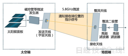 利用微波發(fā)生器將太陽(yáng)能電池的直流電轉(zhuǎn)換成微波之后發(fā)送出去,通過(guò)整流電路將地面接收的微波重新轉(zhuǎn)換成直流電。發(fā)送微波時(shí),從接收端發(fā)送指示信號(hào)來(lái)通知準(zhǔn)確的位置。