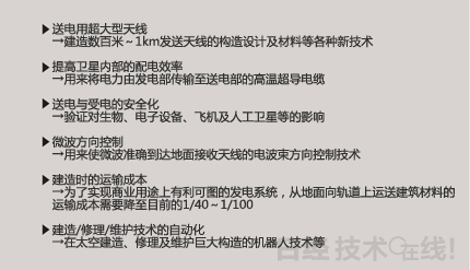 其他還有太陽(yáng)能電池的高效率化、防止宇宙輻射及垃圾的措施等很多課題。