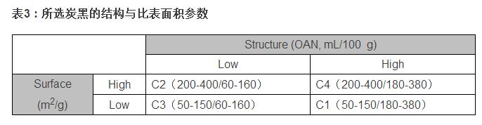 基于以上試驗(yàn)結(jié)果,我們發(fā)現(xiàn)比表面積能夠影響電池的充電接受能力與水損耗值,而結(jié)構(gòu)是炭黑的最要參數(shù),因此在接下來的實(shí)驗(yàn)中我們選取了幾種不同結(jié)構(gòu)與比表面積的炭黑材料,探討炭黑結(jié)構(gòu)與比表面積對(duì)電池性能的影響,選取的炭黑參數(shù)如下: