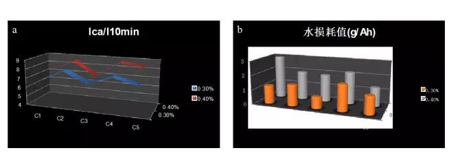 如圖7b所示,在0.3%與0.4%添加量下,C2與C4高比表面積的碳會(huì)相應(yīng)增加電池的析氫電位,使電池的水損耗值增加,因此,在選擇高比表面積的碳材料使因考慮添加量,并盡量不要使用過大的比表面積的炭黑材料(在0.4%添加量下,C1水損耗值大幅增加,可能是由于C1炭黑雜質(zhì)偏多)