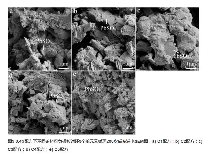 圖9 0.4%配方下不同碳材料負(fù)極板循環(huán)3個(gè)單元又循環(huán)200次后充滿電SEM圖,a) C1配方;b) C2配方;c) C3配方;d) C4配方;e) C5配方