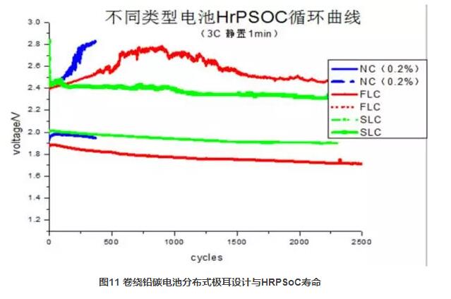 在高碳的應(yīng)用主要體現(xiàn)在80倍率卷繞電池中,基于多年鉛碳電池配方的研究基礎(chǔ),選用了獨(dú)特的碳添加劑與最優(yōu)的添加量,能夠最大程度地提高電池的充電接受能力與循環(huán)壽命,有效避免負(fù)極表面發(fā)脬、疏松。如圖12,這款80倍率卷繞電池在結(jié)構(gòu)設(shè)計(jì)上,采用分布式板耳與TMF超薄極板技術(shù),對(duì)于部分客戶采用全板耳的結(jié)構(gòu)設(shè)計(jì),使電流的輸出分配更加合理,并且增加了極板的反應(yīng)面積。普通電池(編號(hào)NC)的HRPSoC壽命充電電壓很快達(dá)到上限,普通的鉛碳電池(編號(hào)FLC)壽命在普通電池的基礎(chǔ)上提高了4-5倍,但是由于充電接受能力不夠理想達(dá)到了電壓下限,而優(yōu)化設(shè)計(jì)后的卷繞鉛碳電池(編號(hào)SLC)在普通鉛碳電池壽命結(jié)束終止時(shí)電壓仍在1.9V以上。