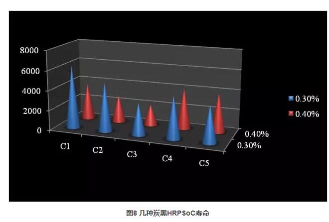 對(duì)于HRPSoC壽命(圖8),在0.3%與0.4%添加量下高結(jié)構(gòu)的炭黑(C1與C4)在選取的幾種炭黑中有利于電池的HRPSoC壽命。