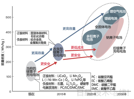 目前推進(jìn)的材料開發(fā)的目標(biāo)是,2020年在確保安全性的同時使能量密度達(dá)到300Wh/kg。2030年使Li-S電池和鋰空氣電池等500Wh/kg以上的新一代電池實現(xiàn)實用化。