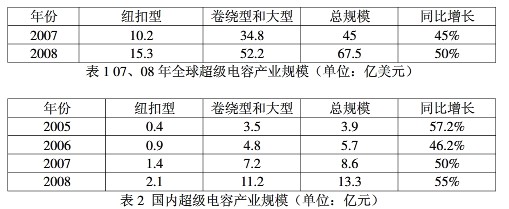 表1、表2是對三種超級電容器產業(yè)規(guī)模進行調查而得到的數據整理而成的,分別反映了世界和中國超級電容器產業(yè)的情況。從這兩個表中我們不難發(fā)現三個問題: