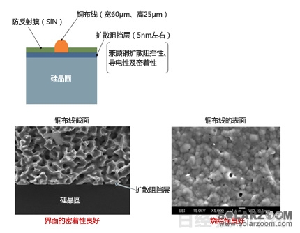 所以將銀布線換成銅布線一直備受全球太陽能電池廠商的關(guān)注。但該領(lǐng)域存在銅向硅中擴散,導致太陽能電池單元性能變差,以及銅在燒結(jié)時氧化,導致電阻值升高等問題。東北大學通過(1)在硅晶圓與銅布線之間形成擴散阻擋層防止銅擴散,(2)改進銅膏的燒結(jié)條件防止氧化等措施解決了上述問題。