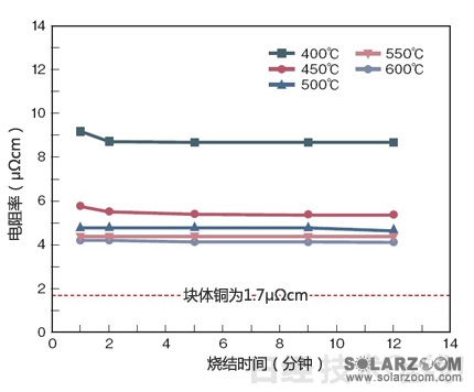 在500℃下燒結(jié)1分鐘燒結(jié)后,銅布線電阻率變?yōu)榕cAg布線同等或更小的5μΩcm左右。即使延長燒結(jié)時間,電阻率也不會上升,因此可在充分防止銅氧化的同時進行燒結(jié)(圖2)。另外還證實,調(diào)整燒結(jié)氣體的話電阻率還可降至3μΩcm左右。