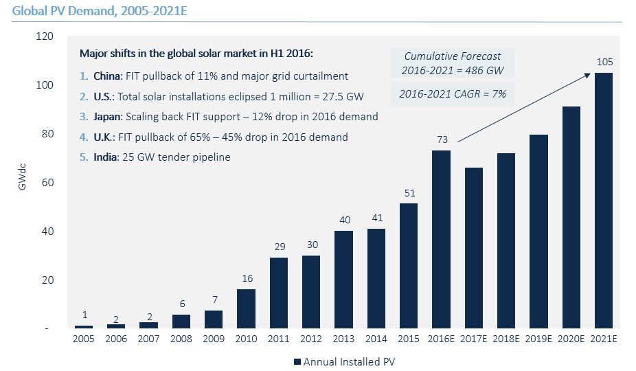 中國儲能網訊:根據(jù)GTM最新發(fā)布的太陽能需求監(jiān)測報告來看,2016年,全球新增太陽能裝機容量將比去年增長43%,達到73吉瓦。