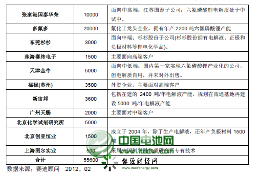 隨著新能源汽車產(chǎn)業(yè)化浪潮的逐步到來,鋰離子電池的巨大市場空間帶動了整個上游電池材料產(chǎn)業(yè)的快速發(fā)展,就電解液而言,受益于下游需求的擴張,整個電解液產(chǎn)業(yè)呈現(xiàn)出產(chǎn)銷兩旺的局面。從產(chǎn)能來看,中國主要電解液生產(chǎn)商均在大張旗鼓的擴大產(chǎn)能,拒不完全統(tǒng)計,截止到2011年底,中國主要電解液廠商的產(chǎn)能合計達(dá)到55600噸。