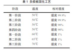 負極板的制備是將鉛粉 、 碳 材 料 、 密 度為1.26g/cm3 的硫酸及添加劑等原材料在一定的工藝條件下混合而成,將和好的膏體利用手工涂板的方式涂在板柵兩面。負極板的固化干燥按表 1 工藝進行,共72 h。