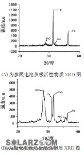 圖 3 是化成后含碳負極板以及參照電池中負極板活性物質(zhì)的粉末 X 射線衍射(XRD )圖,從圖中可以看出,對照電池負極活性物質(zhì)中主要成分是鉛和氧化鉛;而在鉛碳電池負極板中,炭黑的加入使純鉛的峰強度明顯減弱,而相比較下,氧化鉛的峰強度則明顯上升。有文獻報道,由于碳材料的密度與鉛粉相差很大,故添加炭黑后負極板的孔隙率大幅上升,使得負極板易被氧化。