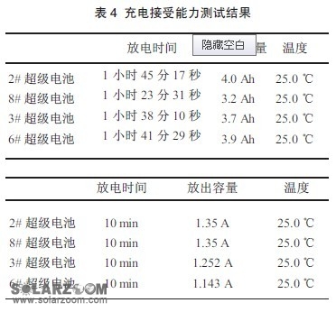 其測試結(jié)果如表 4 示,從中可發(fā)現(xiàn)鉛碳電池的 充電接受能力高于對照電池。其原因可能如 3.1 中 負極板活性物質(zhì)的掃描電鏡圖所示,因炭黑本身具有較好的導電性,所以添加到負極活性物質(zhì)中的炭黑能夠在鉛 / 硫酸鉛顆粒中形成較好的導電網(wǎng)絡(luò),從而可以改善電池的充電接受能力。