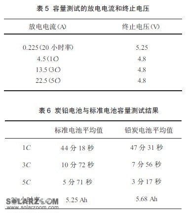 電池容量測試終止電壓及結(jié)果如表 5 和表 6 所示。可以看出鉛碳電池 20 小時率初始容量高于對 照電池( 鉛碳電池負極板和對照電池負極板重量相同 ),這可能由于碳材料加入到負極活性物質(zhì)中,提高了負極活性物質(zhì)的比表面積和極板的孔隙度,從而使電解液與活性物質(zhì)更加充分地接觸,提高了活性物質(zhì)利用率。在大電流放電測試中,鉛碳電池1C 放電優(yōu)勢明顯,但3C、5C 放電性能不如對照電池。重新對鉛碳電池做1C 放電測試,結(jié)果1C放電放電時間降低了6~7 min,鉛碳電池大電流放電性能比差。