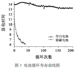 恒流 2.5C,終止電壓為4.8 V,在25 ℃下進行 循環(huán)壽命測試。從圖5可以看出,鉛碳電池循環(huán)壽命很差,僅僅循環(huán)了39 次就達到了循環(huán)終止的要求,而參照電池循環(huán)性能穩(wěn)定。通過電池鎘電壓實驗和拆卸檢測發(fā)現(xiàn),鉛碳電池的問題出在負極板上,炭黑的加入使極板強度大大降低,特別是化成后對負極板損傷更為嚴重,表面滲出一層碳材料,從而導致其循環(huán)性能降低;碳材料的加入會使負極板析氫嚴重,也會對電池的循環(huán)壽命產(chǎn)生不利的影響。
